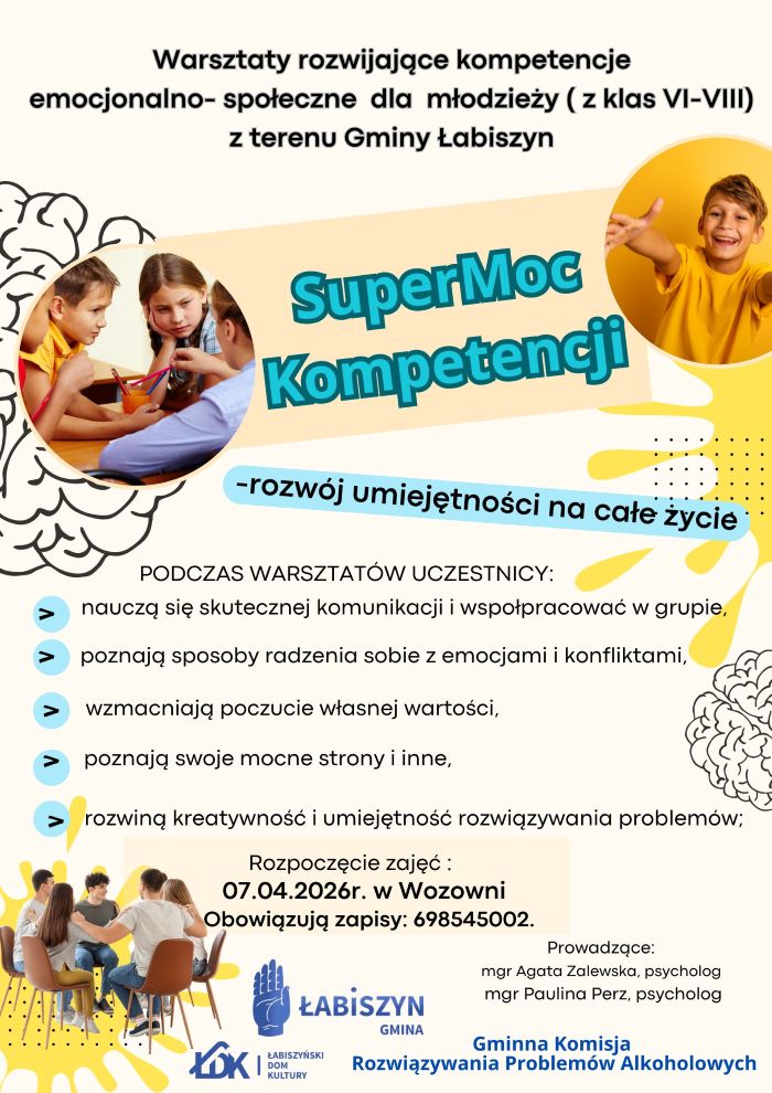 Zapraszamy młodzież z klas VI-VIII z Gminy Łabiszyn na warsztaty rozwijające kompetencje emocjonalno- społeczne, które są niezbędne w codziennym życiu.
